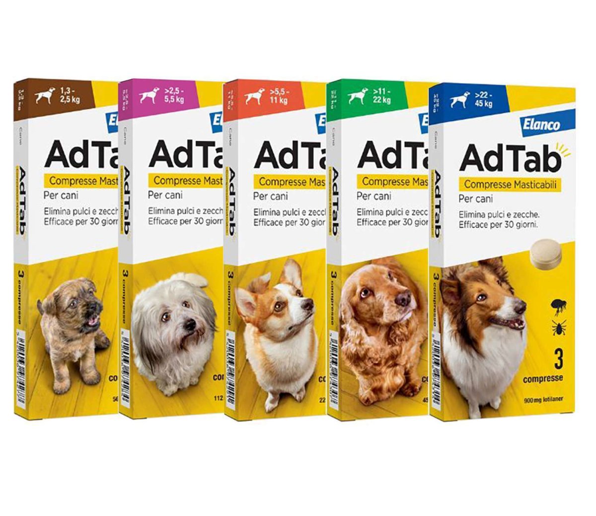 • AdTab compresse masticabili per cani รจ disponibile in 5 formati (da 1,3 a 2,5 kg, da 2,5 a 5,5 kg, da 5,5 a 11 kg, da 11 a 22 kg, da 22 a 45 kg);