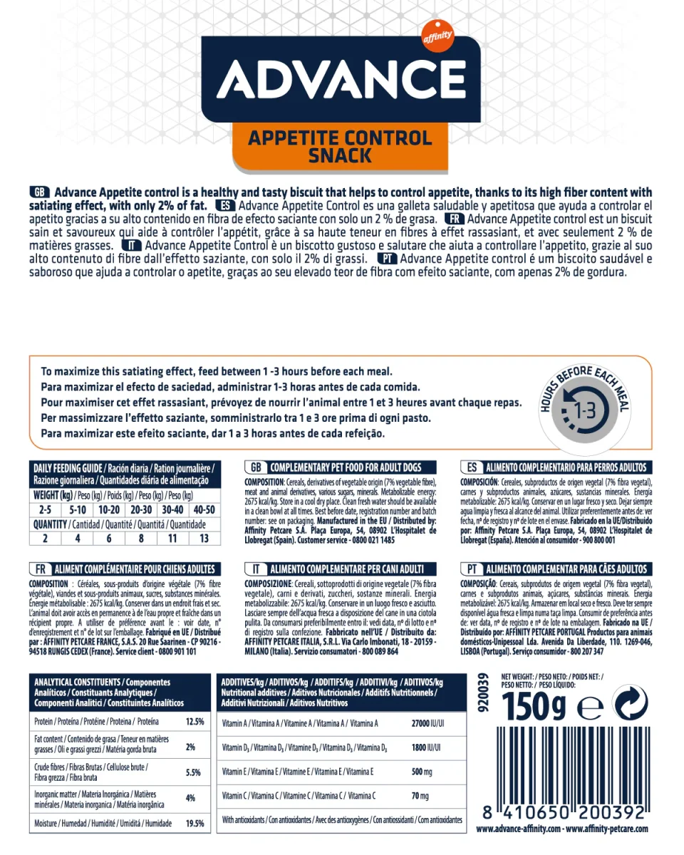 ADVANCE Apettite Control è un biscotto sano e appetitoso che aiuta a controllare l’appetito del tuo cane grazie all’alto contenuto in fibra dall’effetto saziante, e con solo il 2 % di grassi. Per massimizzare l’effetto di sazietà, è consigliabile somministrare lo snack da 1 a 3 ore prima di ogni pasto.