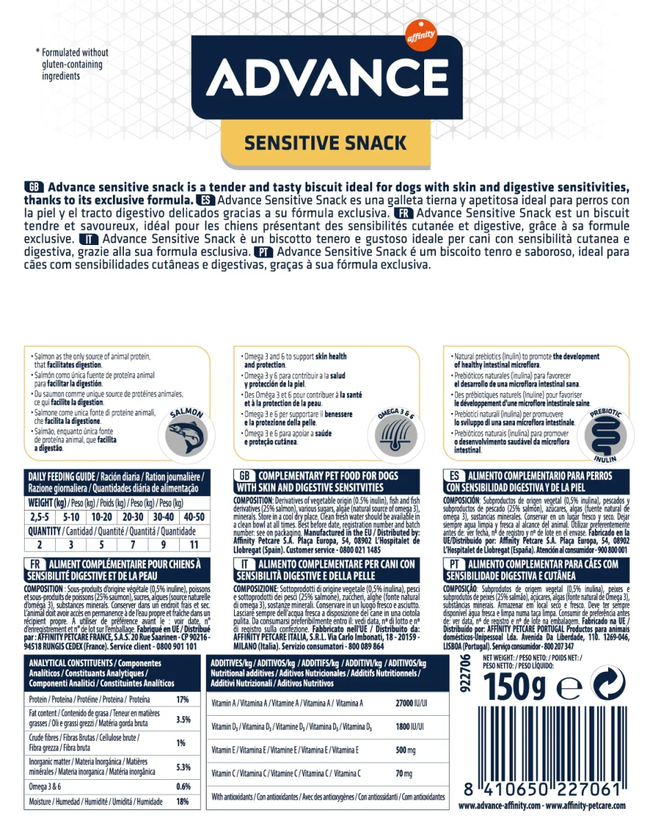 ADVANCE Sensitive Snack è un biscotto tenero e appetitoso, ideale per cani dalla pelle e dal tratto digestivo delicati. La formula con salmone come unica fonte di proteine animali lo rende altamente digeribile, mentre il contenuto di inulina assicura la digestione sana del cane e gli omega-3 e 6 rinforzano la salute e la protezione della pelle