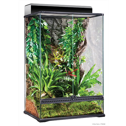 Il terrario di vetro di Exo Terra è l’alloggiamento ideale per l’anfibio o per il rettile ed è stato progettato dagli erpetologi europei. Le porte anteriori di apertura permettono l’accesso facile per la manutenzione e l’alimentazione. Una speciale serratura progettata impedisce la fuga e le porte possono essere aperte separatamente. La ventilazione della parte superiore permette la penetrazione degli UVB e degli infrarossi, ed è completamente smontabile per un accesso facile allo scopo di decorare o pulire. Nella parte posteriore ci sono 5 griglie richiudibili o ingressi-tubo in entrambi i lati per installare le Heat Wave Rock, cascate, sensori, ecc. La parte inferiore del terrario è progettata per montare un tappetino riscaldante allo scopo di riscaldare una parte della superficie del suolo. La finestra anteriore fissa supplementare è ideale per gli strati spessi dei substrati, per le parti acquatiche (paludarium) o per montare una tana scelta dalla gamma Exo Terra. Lo sfondo è dello stesso colore di tutti gli altri articoli decorativi di Exo Terra (Water Dishes, Waterfalls, Heat Wave Rocks, etc.) offrendo un aspetto naturale oltre ad una migliore facilità rampicante.