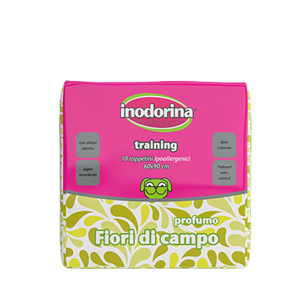 Inodorina Tappetino Igienico con Sticker adesivo igienico super assorbente con polimeri odor control garantisce massima igiene per la casa ed il pet, ed è disponibile nelle profumazioni Neutro e Fiori di Campo.
