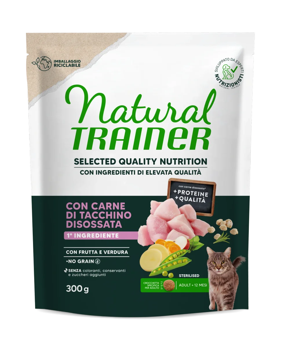 La gamma Natural Trainer Selected Quality Nutrition offre al tuo gatto un’alimentazione di alta qualità con carne di tacchino disossata e cereali non raffinati come riso integrale, orzo e avena. Inoltre, gli ingredienti come carota, mela, rosmarino e alga kelp forniscono fibre e sostanze minerali essenziali per una migliore digestione e nutrizione.