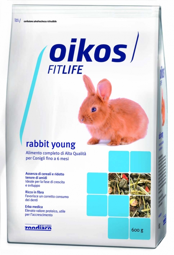 Oikos Fitlife Rabbit Young è un alimento completo adatto ai conigli fino a 6 mesi d’età . L’assenza di cereali, il ridotto tenore in amidi e il bilanciato apporto di proteine sono elementi fondamentali per il corretto sviluppo dell’animale. L’elevata percentuale di fibra favorisce un adeguato consumo della dentizione e mantiene sempre attivo l’apparato gastroenterico. Il ridotto apporto di calcio unito a un equilibrato rapporto calcio/fosforo aiuta a diminuire il rischio di sovraccarico dell’apparato urinario.