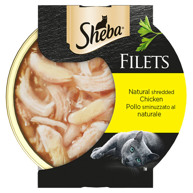 Sheba Filets รจ un esclusivo alimento umido complementare preparato con componenti di altissima qualitร ed รจ privo di coloranti, conservanti e aromi artificiali. Sheba Filets รจ a base di gustosi filettini di carne o pesce arricchiti dal loro sughetto di cottura, con il quale potrete viziare il vostro gatto.