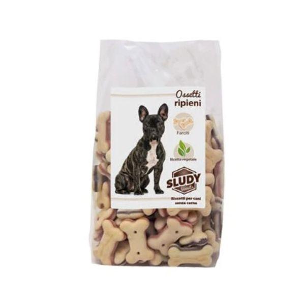 Sludy Biscotti Ossetti Ripieni sono un alimento complementare per cani. Biscotti farciti realizzati con una ricetta vegetale. Formato 500 gr – Dimensione biscotti 4 cm