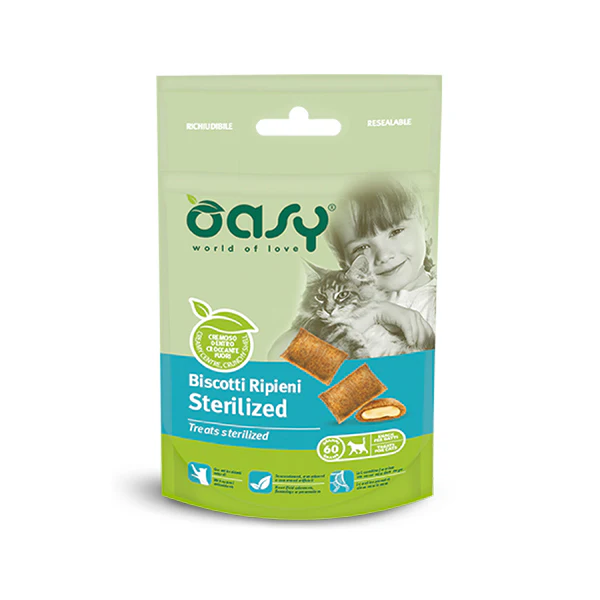 Deliziosi biscotti croccanti dal cuore cremoso con antiossidanti naturali e L-carnitina: lo snack perfetto da offrire al tuo gatto sterilizzato in ogni momento.