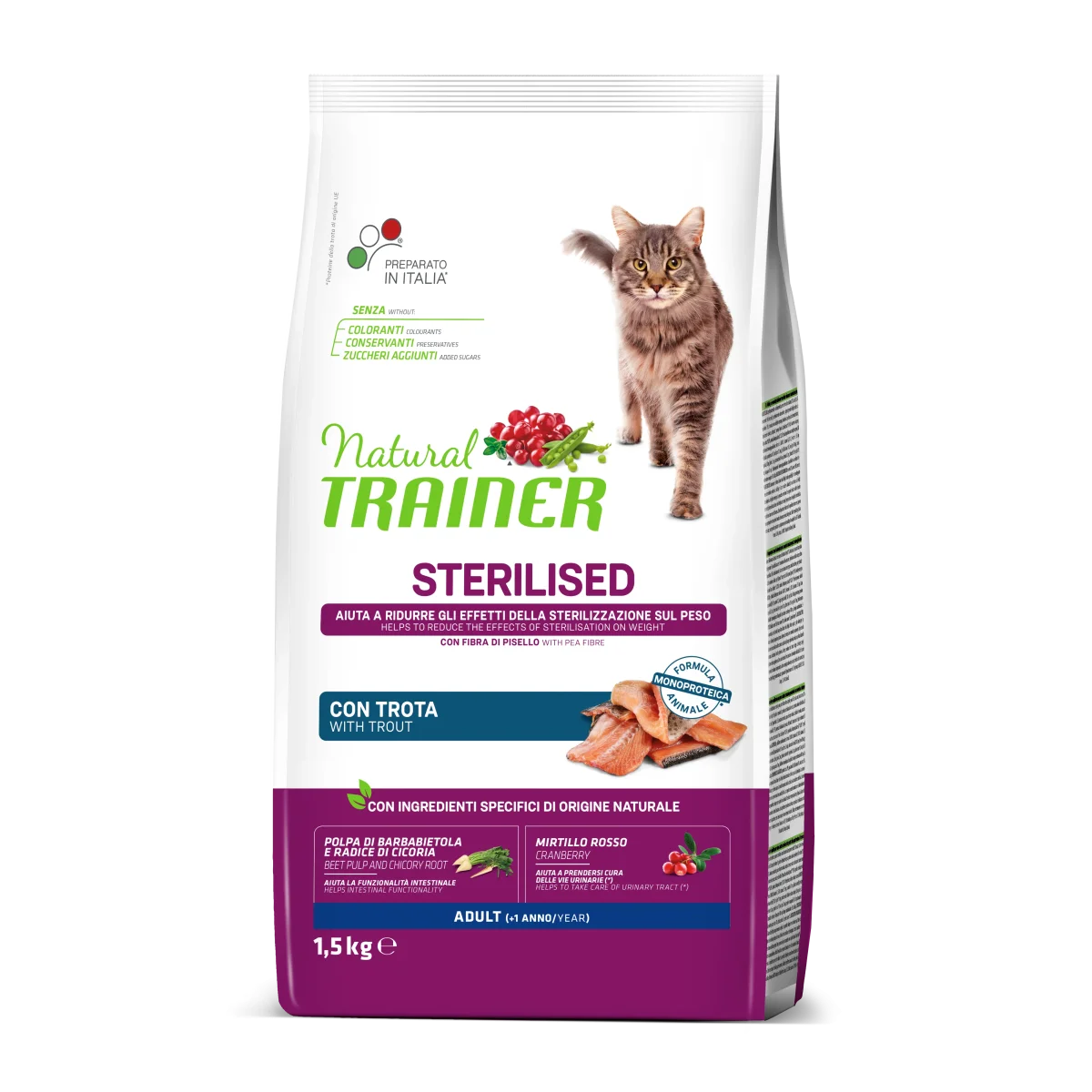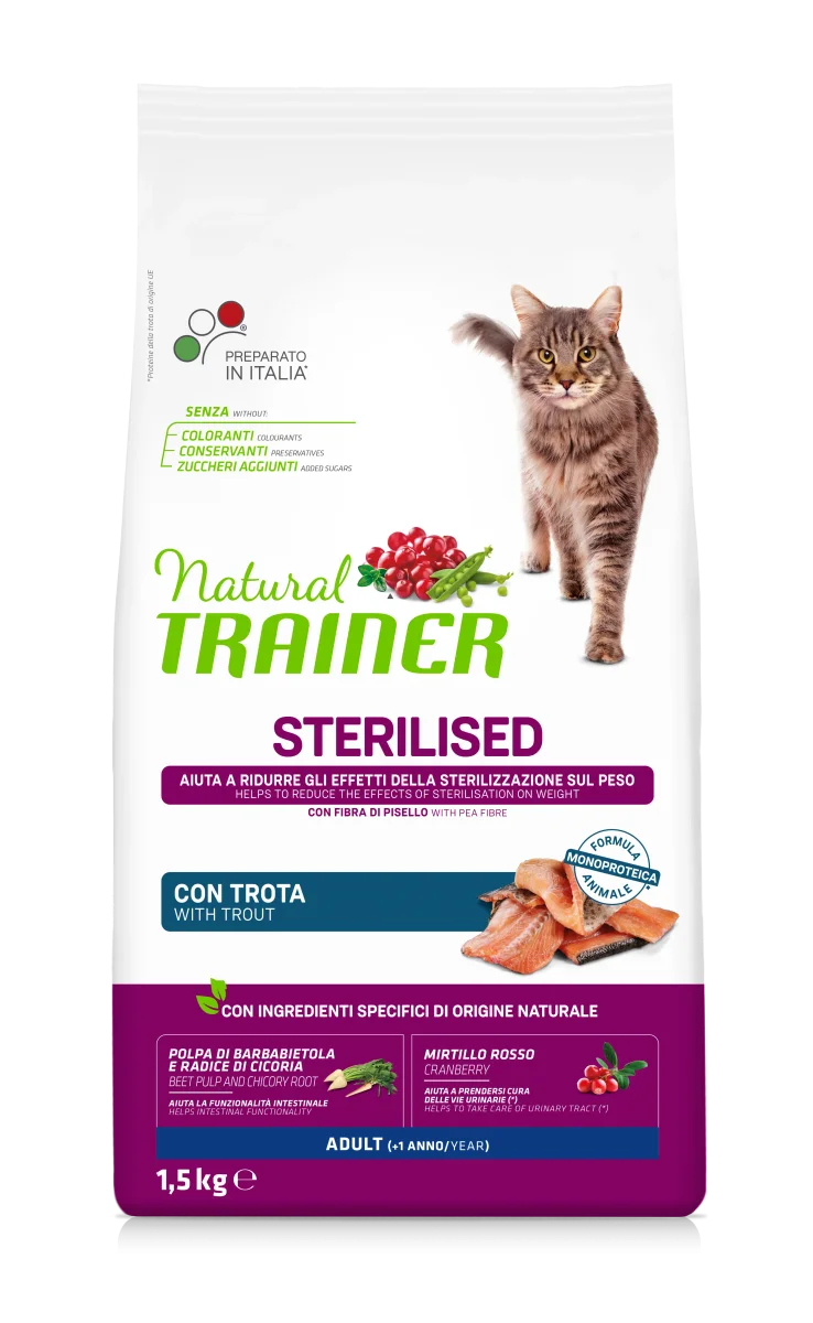 Trainer Natural Adult Sterilised con Trota è un alimento completo per gatti sterilizzati da un anno d’età che aiuta a ridurre gli effetti della sterilizzazione sul peso. Il cibo secco Trainer Natural aiuta a mantenere la perfetta forma fisica attraverso una nutrizione mirata a ridotto apporto calorico e realizzata con nobili proteine della carne fresca di tacchino. Favorisce la freschezza dell’alito grazie all’estratto di menta piperita e del propoli. Consente di cambiare gusto in totale sicurezza e favorisce una corretta digestione grazie ai FOS, Prebiotici e Lievito di birra contenuti. Aiuta a preservare nel tempo la salute e la funzionalità delle vie urinarie attraverso le sostanze benefiche dell’estratto secco di mirtillo rosso.