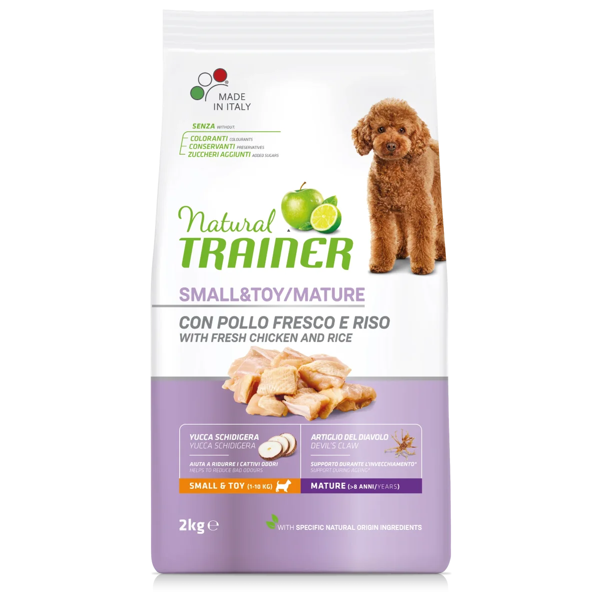Natural Trainer mini Mature con Pollo crocchette per cani di taglia piccola e toy, alimento completo con pollo fresco e ingredienti selezionati. Le naturali proprietà dell’estratto di Yucca contribuiscono a ridurre l’odore delle feci, aiutando a limitare le fermentazioni proteiche intestinali. La presenza di ingredienti che supportano la funzionalità articolare (artiglio del diavolo, semi di lino e peptidi bioattivi di collagene), i livelli controllati di minerali, la proteina di elevata qualità e le vitamine aiutano a supportare il cane durante l’invecchiamento. Inoltre Natural Trainer Small&Toy Mature con Pollo è ideale per il controllo del peso del cane maturo.